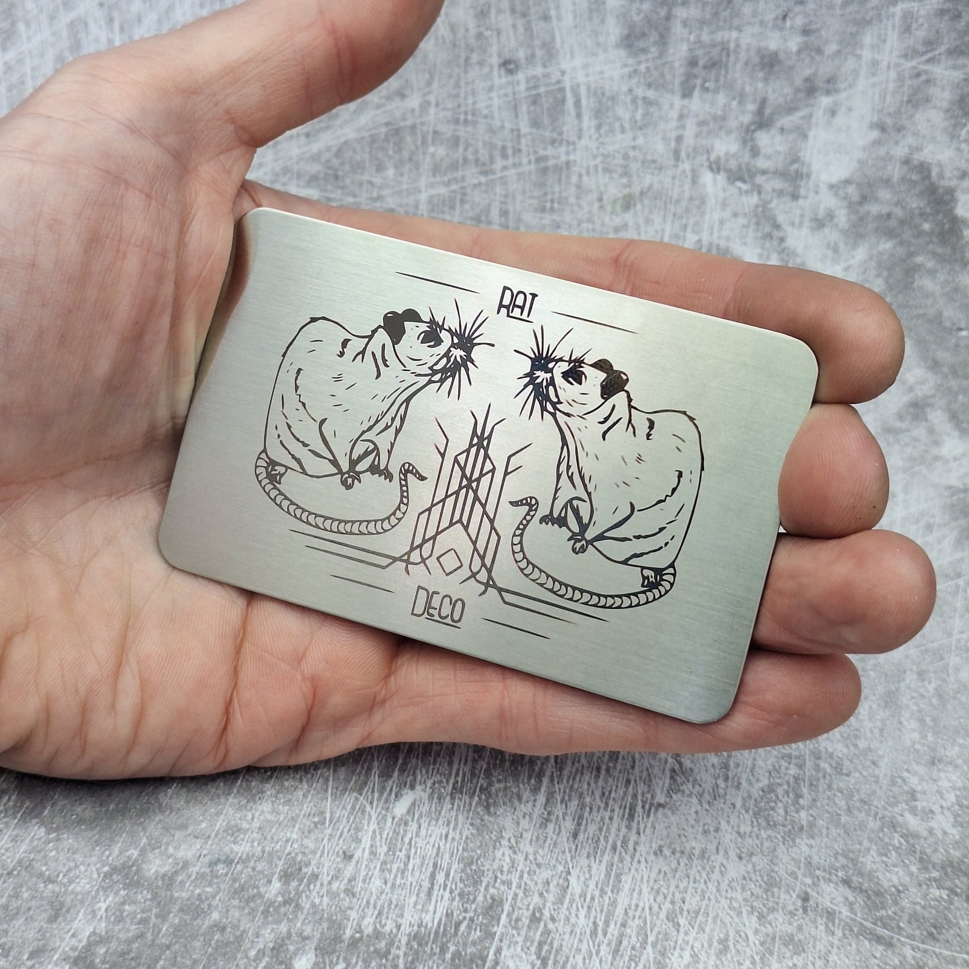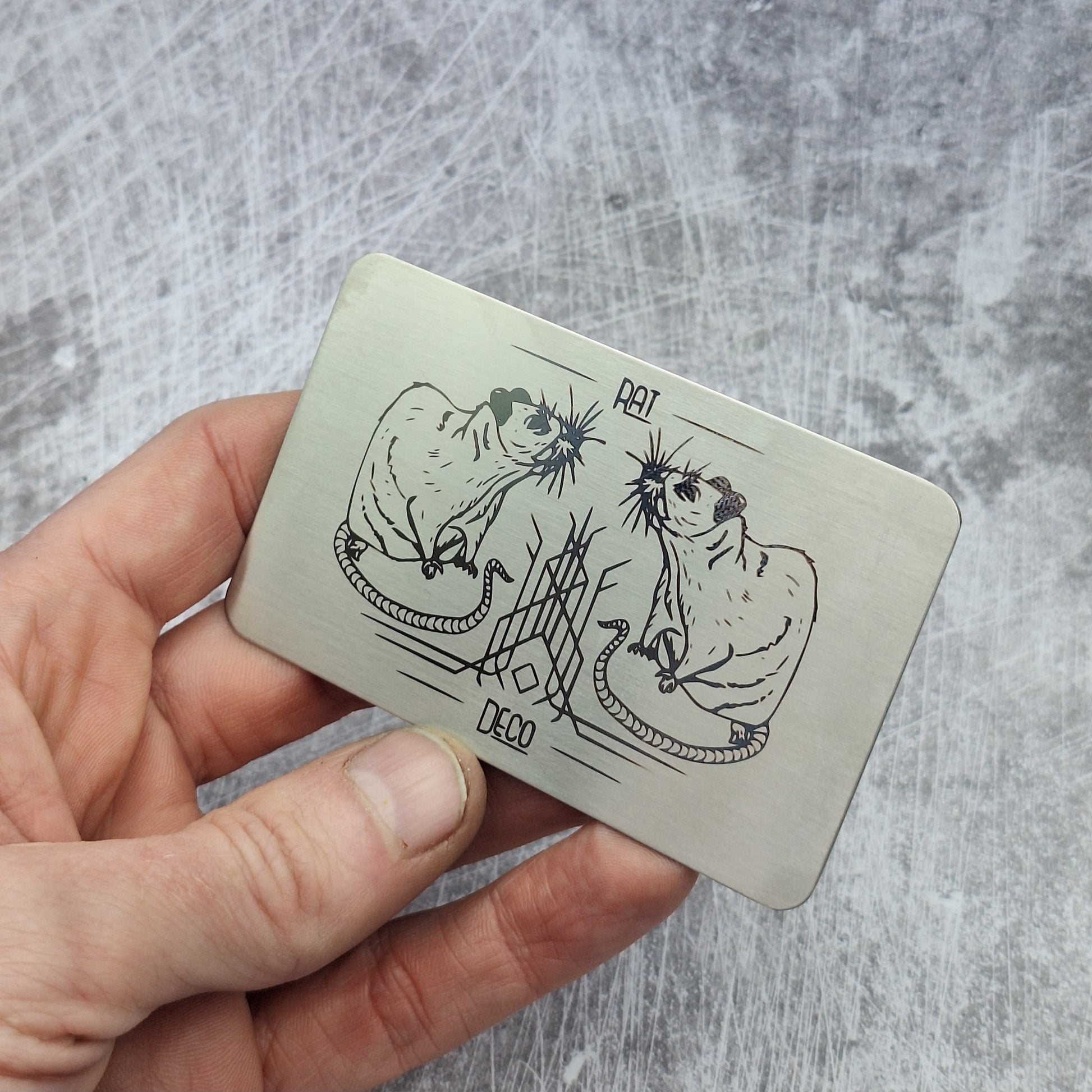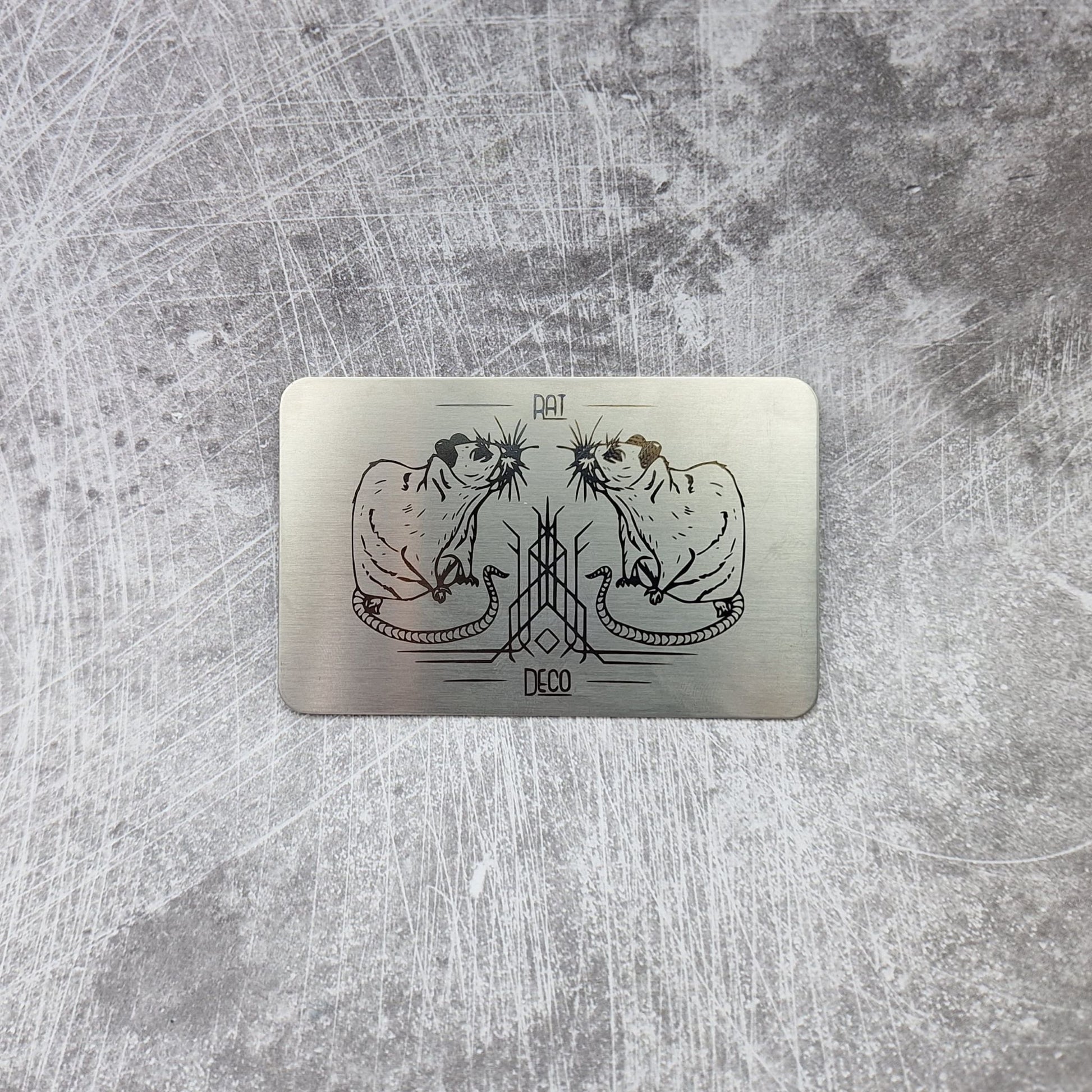 Here's a sketch I did of a rat, made into a whimsical graphic and laser engraved onto metal cards.